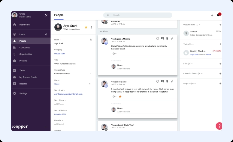 The Copper CRM system was mainly created to grow customer relationships and manage sales. This makes it one of the preferred options for small business owners. Besides, it integrates with G Suite well, which means that if you’re a Gmail user, you’ll see your contacts and meetings synchronize quickly and easily.