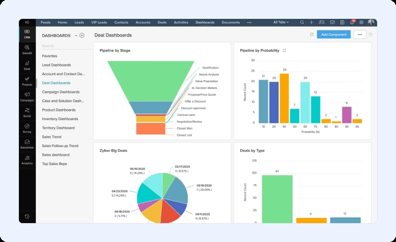 Zoho is another popular cloud-based CRM system that comes with plenty of features. One of the features that makes it so popular is its customization. The truth is that the degree of customization allowed is so extensive that you can have a unique version of this CRM created by you to meet all your needs and wants.