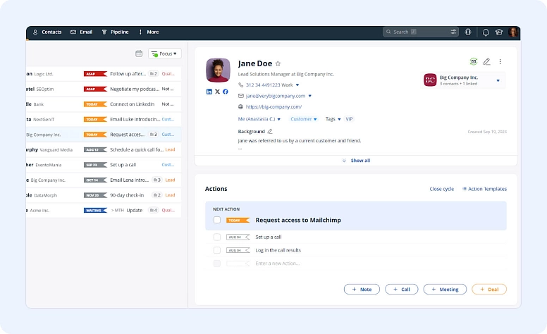 In OnePageCRM, you can run your whole business from just one tab: track follow-ups, send emails, make calls, and much more. This CRM also has a two-way email sync and integrates with different business apps, such as Mailchimp, QuickBooks, and so on.