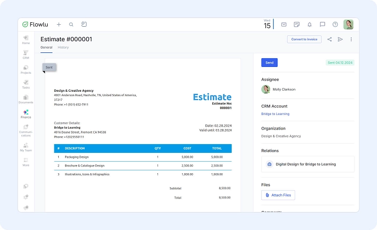 As soon as your estimate is ready, you can send it via email directly from Flowlu. And when the client approves it, Flowlu can help you once again by converting the estimate into an invoice with just a single click.