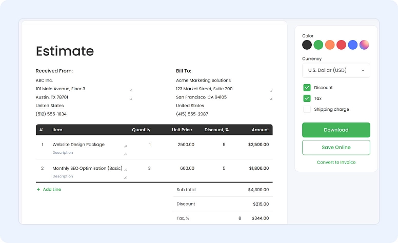 - Estimate: A non-binding document that outlines the expected cost and timeline. It gives the client a general idea before work begins.