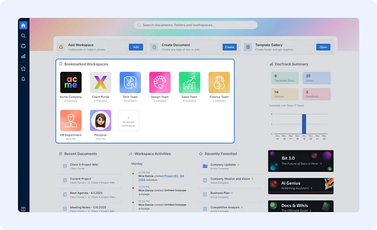 Bit.ai lets you create beautiful and interactive documentation. You can insert videos, links, or images inside your pages, making the information more visual and easy to understand. It’s very modern and pleasant to use, but the interface may take a little time to get familiar with. Pricing starts from $8 per member per month.