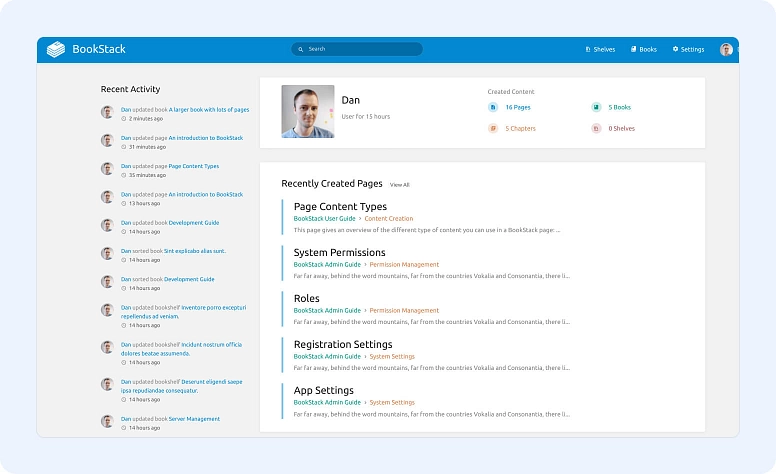 BookStack is an open-source software that organizes content like books and chapters. It’s very good for keeping information structured and clear. You can host it yourself, which gives full control of your data and design. The only point to consider is that you require some technical knowledge for the installation. BookStack is free to use.
