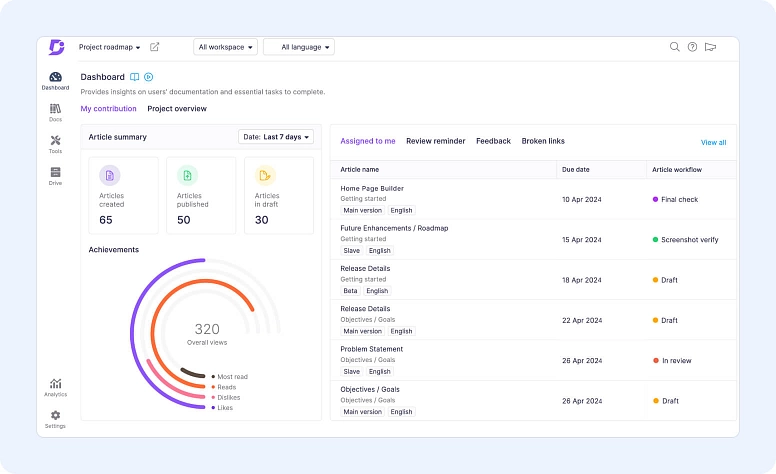 Document360 is made especially for documentation and knowledge bases. It has a simple editor and lets you organize and track how employees use the content. The interface is modern and clear, and it includes version history to control updates. Still, it has fewer integrations compared to other tools. Pricing starts from $149 per project per month.