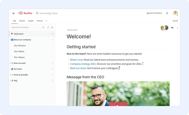 Nuclino is a simple and light tool that helps teams to collaborate and document everything in real time. It is fast and easy to use, which makes it perfect for teams that don’t need too many features. However, it’s not ideal for big companies that need complex access control or a lot of customization. Pricing starts from $5 per user per month.