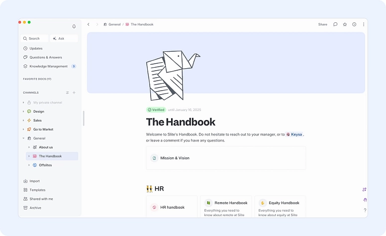 Slite is a great tool for teams that want to write notes, share ideas, and build internal documentation in one place. It’s clean and modern, with a very friendly editor. It works great for small and medium teams, but when there is too much content, the search function could be better. Pricing starts from $8 per user per month.