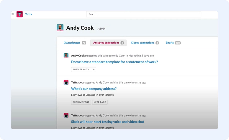 Tettra helps teams to share knowledge quickly and stay aligned. It connects easily with Slack and Microsoft Teams, so everyone can ask questions or suggest updates. It is simple and easy to use, but it does not have many options to customize the appearance of the pages. Pricing starts from $8 per user per month.