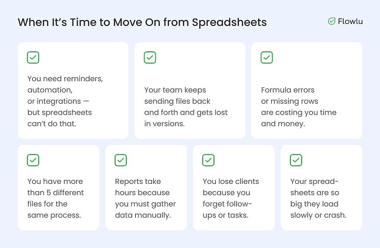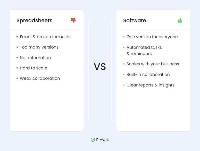 When your team grows, when you have many customers, or when you need data reports, it is time to stop using spreadsheets. At that point, systems like Flowlu will save you time, reduce mistakes, and give you better control.