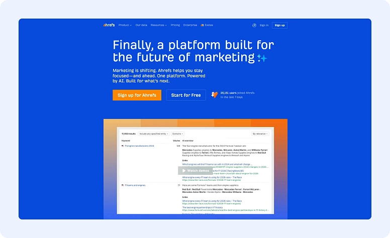Ahrefs is a SaaS marketing platform built for tomorrow’s web. We help marketers make their brands discoverable – and unmissable – online, with 15+ years of real-world web data, AI that actually understands marketing, and fast, intuitive tools that keep up with how people discover and decide today. Whether it’s traditional search, social, or emerging AI platforms, Ahrefs gives you the clarity to act – and adapt – in a fast-moving world. If you’re done guessing and juggling disconnected tools, we’re built to help you move smarter, faster, and further.