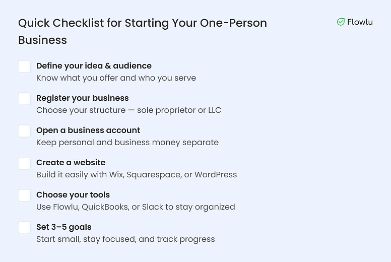 Before you finish reading, here is a short checklist that can help you start your one-person business in an easy and organized way: