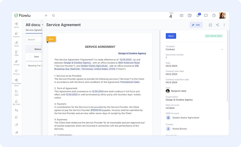 Also, choose how you want to get paid. Many freelancers use PayPal, Wise, or Stripe. If you use Flowlu, you can make invoices in the system and get paid faster. Flowlu also keeps contracts, invoices, and payments together, so you don’t need to switch between many apps. This saves time and makes your freelance work look more professional for customers.