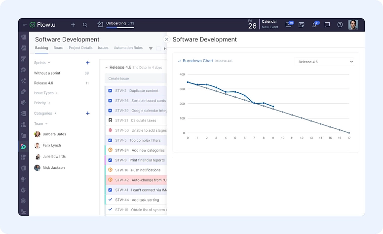 Flowlu’s performance tracking tools are ideal for measuring the pace of team initiatives and flagging resourcing issues early.