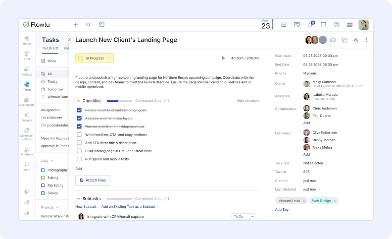 With Flowlu, you can manage your entire freelance business in one place, thanks to dozens of available modules and hundreds of integrations. From its intuitive dashboard, you can organize clients, projects, tasks, and invoices, accept online payments, and even collaborate with other freelancers.
