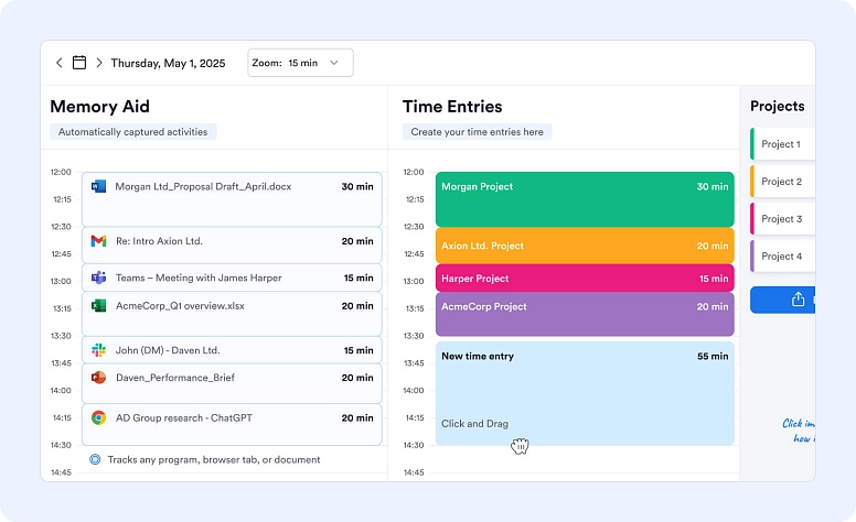 Memtime is a desktop-only app (no mobile version) that tracks your time automatically. It starts as soon as you power on your computer and runs quietly in the background. At the end of the day, you can log into the app to categorize or edit your activities.