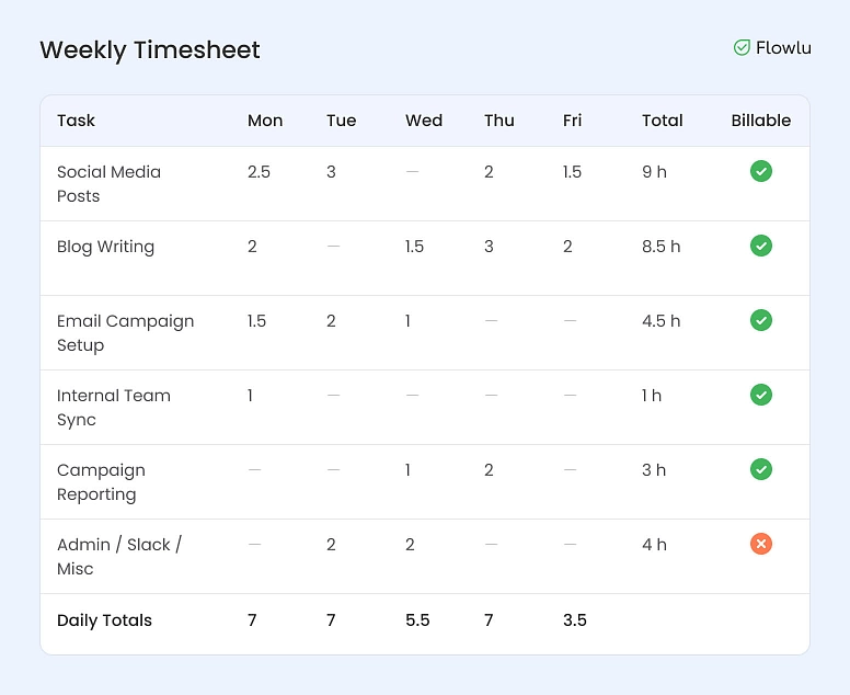Just like freelancers, law firms tend to bill their clients by the hour. Timesheets make it easier to log time spent on consultations, case research, or court appearances. This ensures accurate and transparent billing.