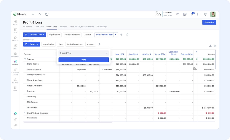 - Clarity — see tasks on a calendar, track project milestones automatically, and compare financial periods side by side.
