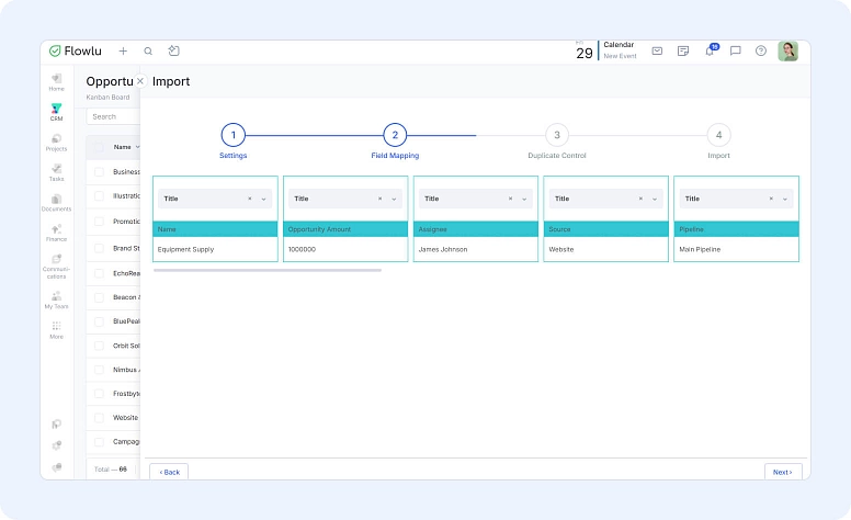 - Adding custom fields like dropdowns, date pickers, and checkboxes (same as in other Flowlu modules).