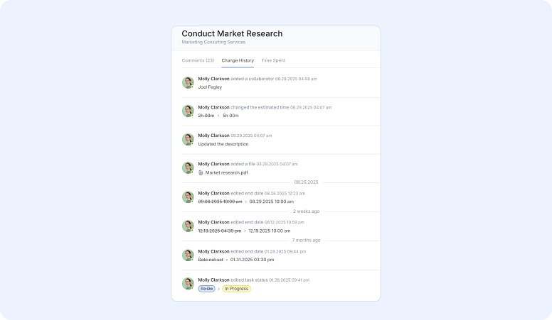 - Change history logs more details: time estimates, description edits, collaborator changes, file updates, and subtask changes.