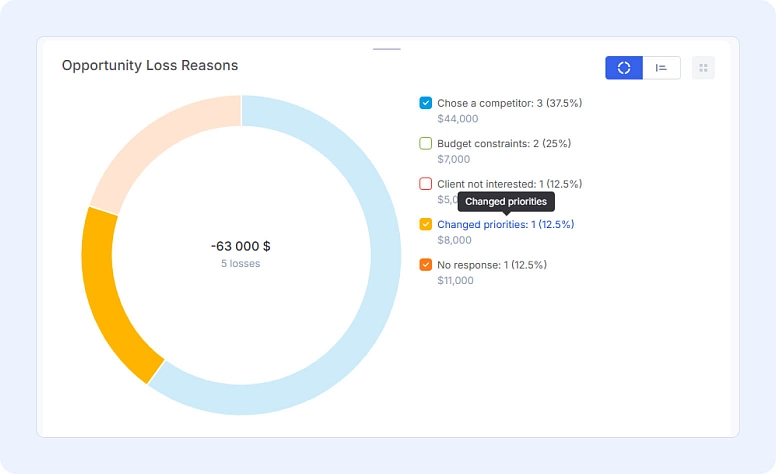 - Percentage View: Now you’ll see not just counts but the % of total lost opportunities for each reason.