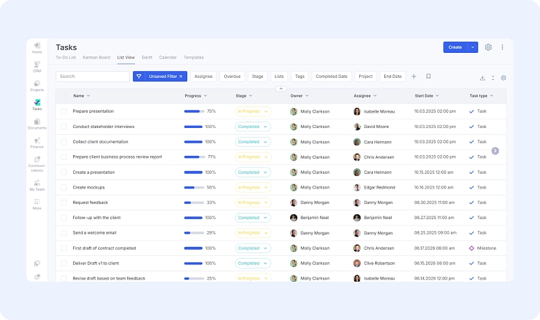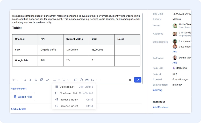 Progress recalculates instantly as subtasks or checklist items change. You’ll see it in task details, Gantt charts, and the task list view.