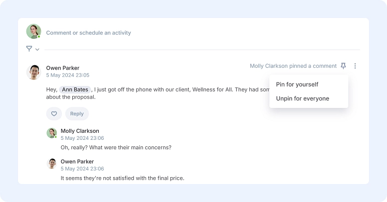 When something matters (like an important update or next step), you can keep it visible for everyone, right where work happens. Pinned comments appear across contacts, tasks, projects, and any object with comments, so your team never misses key context.