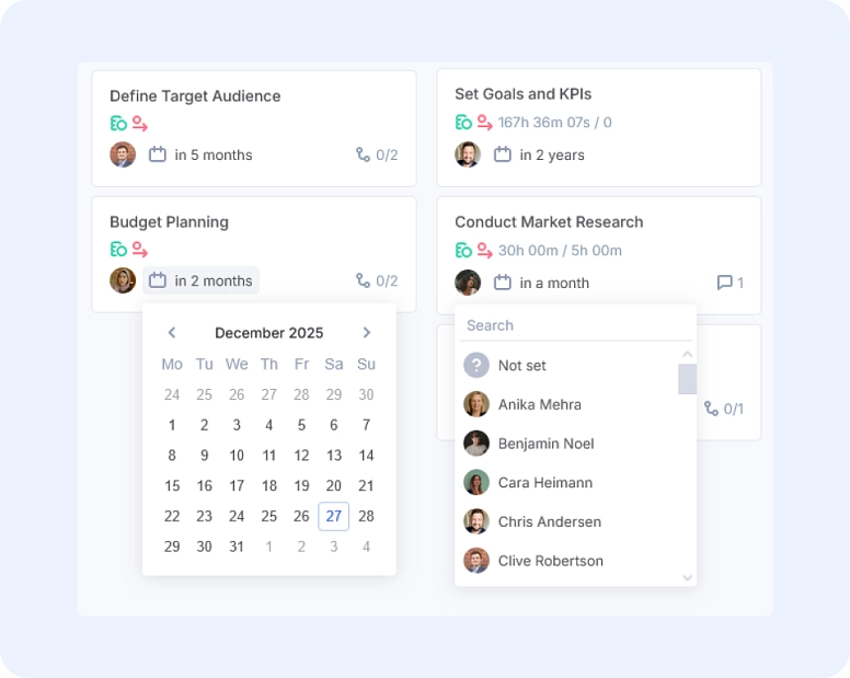 You can now update a task’s name, assignee, or date directly on the Kanban board—no need to open the full task. This makes quick edits easier in project tasks, groups, and the general task board.