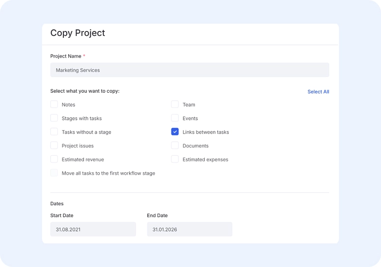 When copying a project, all task dependency links are now preserved, including blocking dependencies. This helps you reuse existing project structures without losing the relationships between tasks.