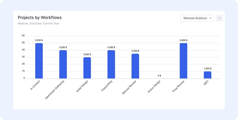 It gives you a clear visual of how many projects sit at each stage of your workflows, displayed as a bar chart.
