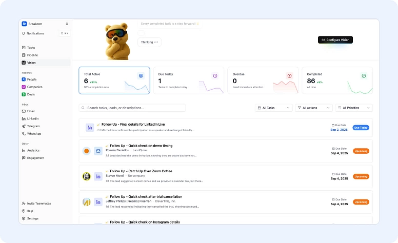 En esta comparativa de CRM, debemos mencionar Breakcold, uno de los primeros CRMs de ventas nativos de IA diseñado para solopreneurs y pequeñas empresas. En pocas palabras, es como tener tu propio asistente de IA. Puedes usarlo para organizar y gestionar contactos, revisar tareas importantes e incluso crear flujos de trabajo a partir de una nota de voz o un prompt de texto.