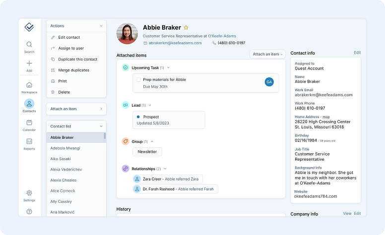Keap gestiona contactos, pipelines de ventas, campañas por correo y SMS, formularios y landing pages, facturación y pagos, y programación de citas, todo en un mismo lugar. También admite etiquetado y segmentación de contactos, puntuación de leads y vista del historial completo del contacto (mensajes, tareas, compras) en una sola pantalla.