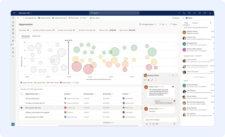 Integrado con una amplia gama de herramientas de Microsoft, Microsoft Dynamics 365 es una gran opción cuando buscas un buen CRM para solopreneurs. Con todas estas herramientas, obtienes muchas opciones de visualización y análisis de datos confiables.