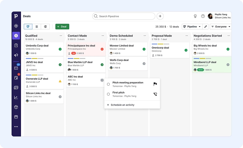 Pipedrive es otro gran CRM diseñado para pequeñas empresas y solopreneurs. Con este CRM, puedes automatizar tus procesos y agilizar tus pipelines de ventas con facilidad. Además, podrás llevar un seguimiento de todas las interacciones con clientes.