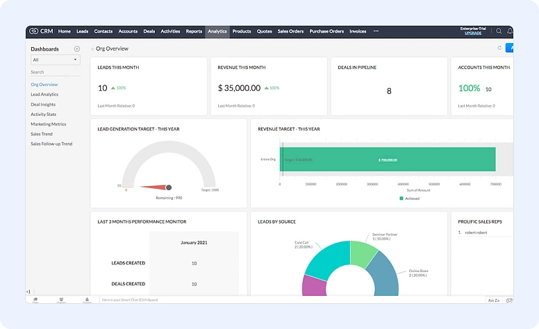 Zoho CRM es otra herramienta popular que puede ayudar a los solopreneurs no solo a gestionar su negocio, sino también a hacerlo crecer. Con una amplia gama de integraciones, Zoho CRM incluye un panel intuitivo y personalizable, disponible tanto en escritorio como en móvil.