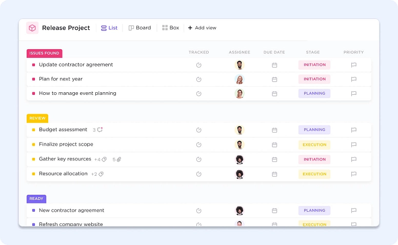 ClickUp markets itself as a highly customizable project management tool with deep task management features and AI‑enabled productivity. It also offers backlogs, sprint planning tools, and custom fields for agile workflows.