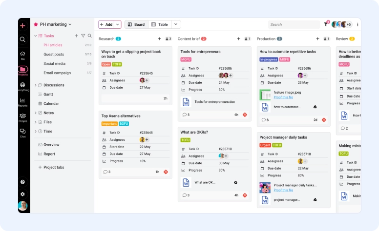 It combines chat, discussions, Gantt charts, Kanban boards, calendar view, custom roles, notes and file storage in one tool.