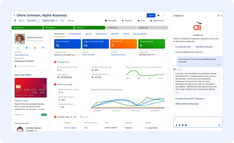 Creatio is a cloud-based CRM platform designed for businesses that need flexibility and customization. One of the things that makes it stand out is its no-code approach, which allows teams to adjust workflows, pipelines, and automations without heavy technical involvement.