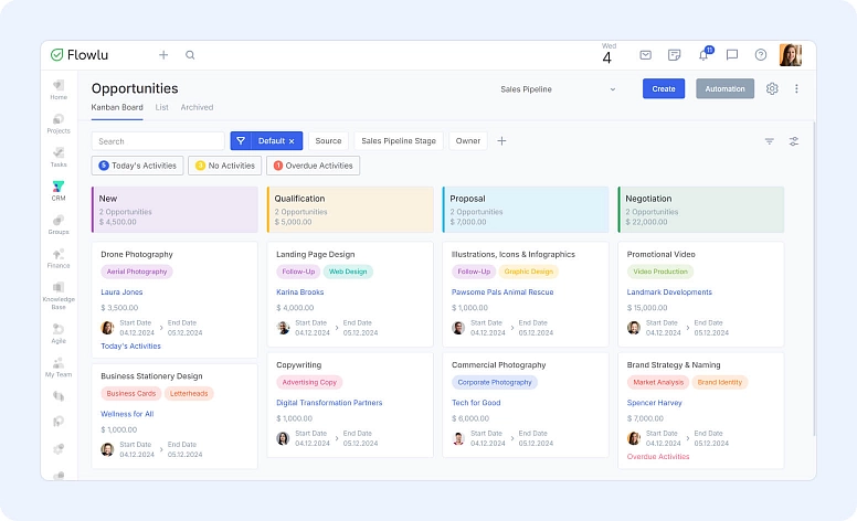 And you can do this with Flowlu in a very intuitive way. You can use the Kanban Board, for example, to support this process. But this powerful software doesn’t stop there. In fact, it also helps you manage all your leads and customers efficiently and automatically, helping you avoid errors and missed steps.