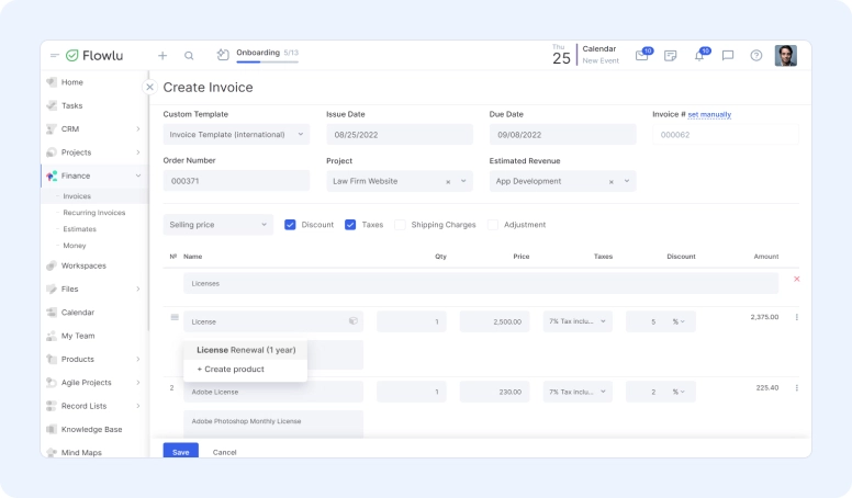 Flowlu provides features such as automated invoicing, expense tracking, and robust reporting, which streamline financial operations, improve cash flow management, and offer a comprehensive view of your business's financial health.