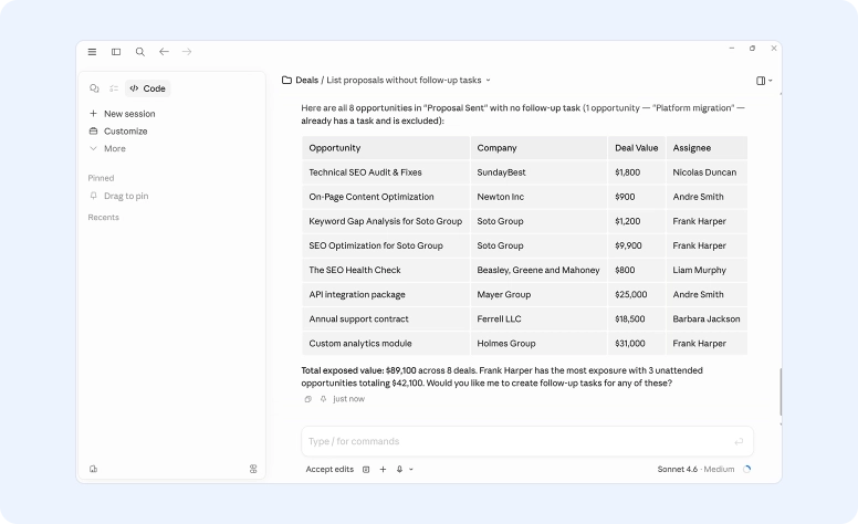 The AI pulls live data from your CRM and gives you a structured answer in seconds. No filters to set, no report to configure, no dashboard to build first.