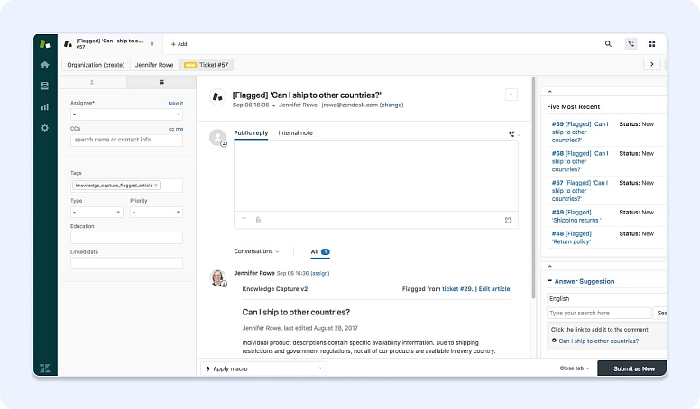 Uno de los mejores ejemplos de aplicaciones CRM que podemos mostrar usando Zendesk es su sistema de help desk. Simplificando, tener un sistema como este permite a los usuarios no solo hacer un seguimiento, sino también gestionar y resolver diferentes solicitudes de clientes fácilmente. Además de recopilar comentarios de los clientes y calificaciones de satisfacción, esta solución también es beneficiosa para tus equipos. Después de todo, toda la información está centralizada en un solo lugar y puede usarse para personalizar las respuestas a los clientes, mejorando su experiencia general con tu empresa.