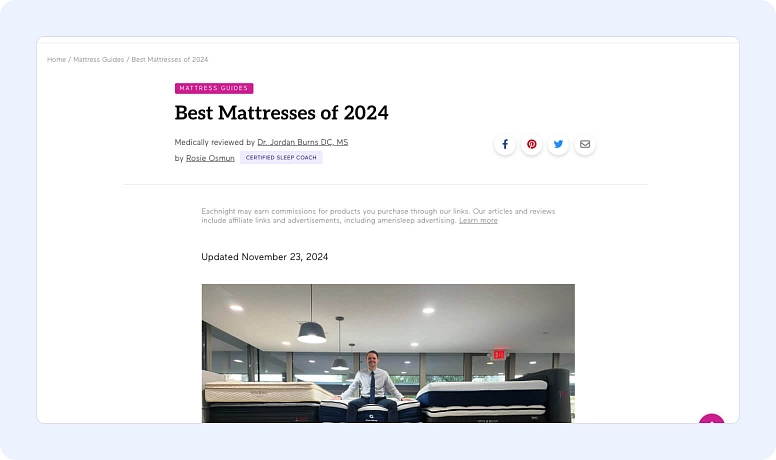 Por ejemplo, sabiendo lo importantes que son los datos científicos y la validez de la información para sus clientes, Eachnight usa perfiles de autores y distintivos de verificación para elevar sus guías de Mejores Colchones. Estos elementos de página comunican que el contenido de la marca está escrito y revisado médicamente por expertos en sueño y salud. También aumentan la transparencia mientras demuestran el compromiso total de la marca en priorizar el valor para el cliente.