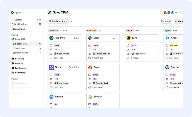 Folk es un CRM construido alrededor de las relaciones, especialmente bueno para quienes hacen networking, dependen del outreach o quieren una herramienta ligera pero inteligente. Obtienes una interfaz tipo hoja de cálculo, pipelines de contactos y tratos, sincronización de correo, herramientas de enriquecimiento con IA y la posibilidad de crear secuencias. Equilibra la simplicidad con suficiente potencia para flujos de trabajo de outreach.