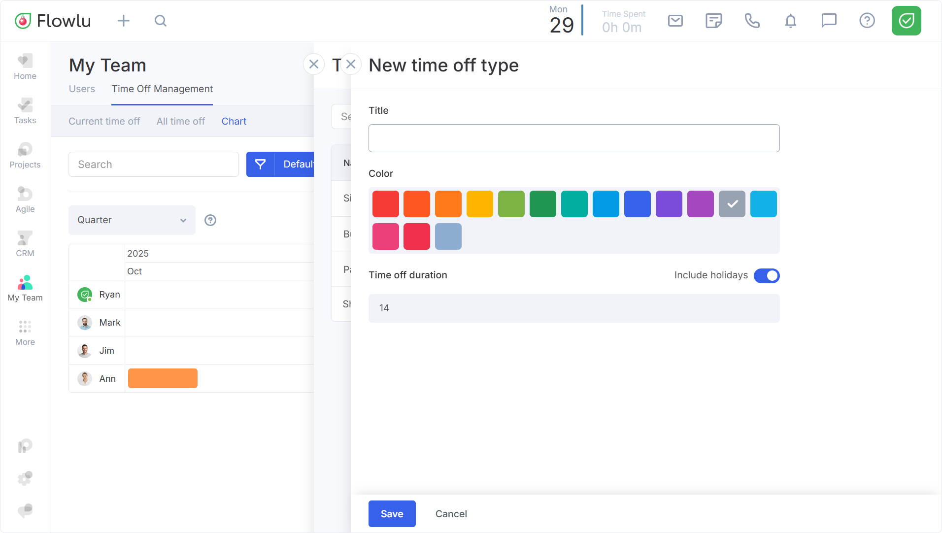 En la ventana abierta, puede especificar el Nombre y seleccionar el color. Además, existe la opción de añadir una duración personalizada, que será la predeterminada para este tipo de ausencia. También puede cambiar la duración de los tipos de ausencia predeterminados (Ausencia Remunerada, Licencia Médica, Viaje de Negocios, etc.). En el gráfico de ausencias, su tipo personalizado se mostrará con el color que elija.