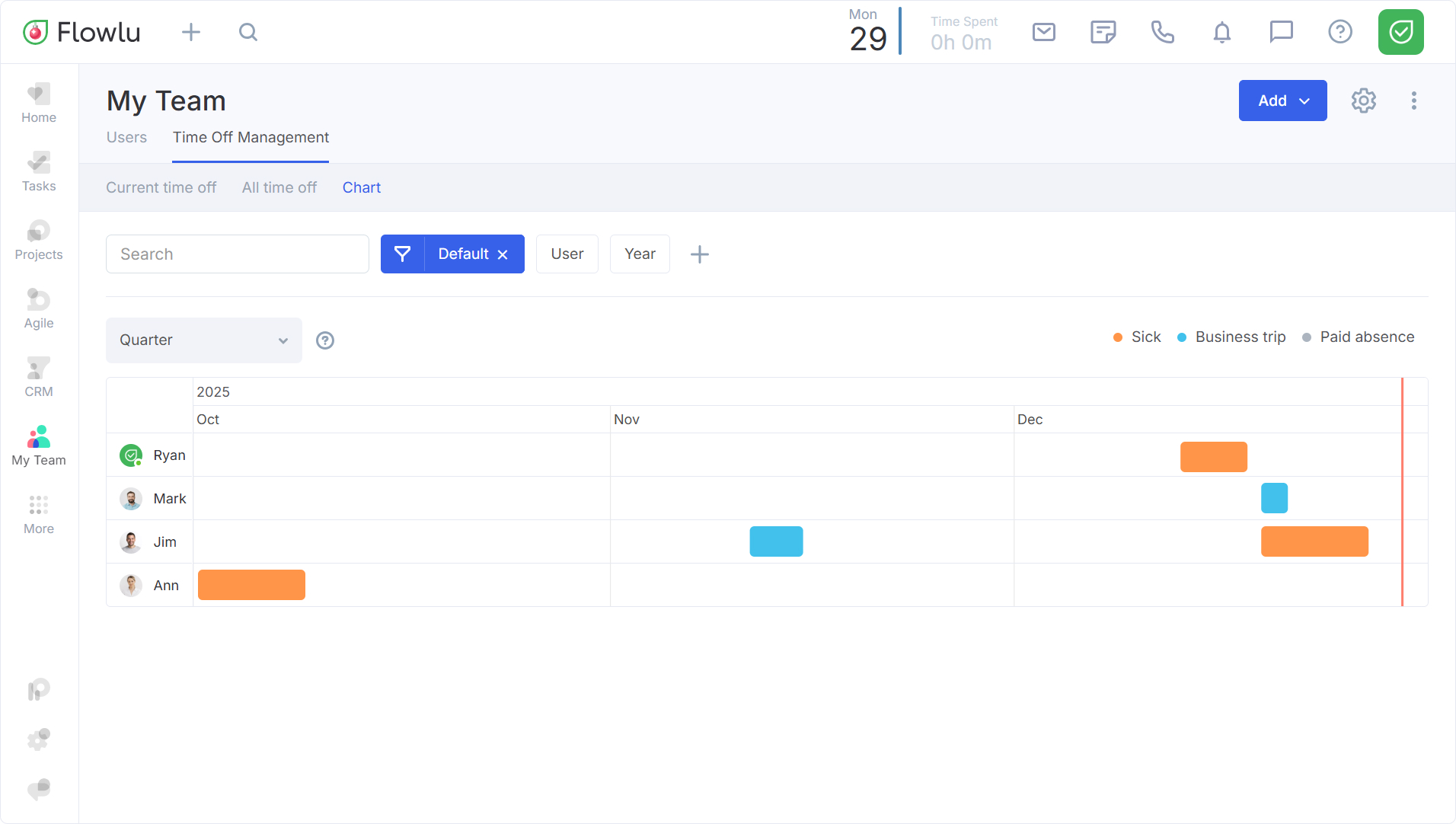 La Gestión de Ausencias le ayudará a mantenerse informado sobre cuándo los empleados o compañeros de equipo están fuera de la oficina, de modo que pueda planificar mejor las actividades y evitar solapamientos en los horarios.