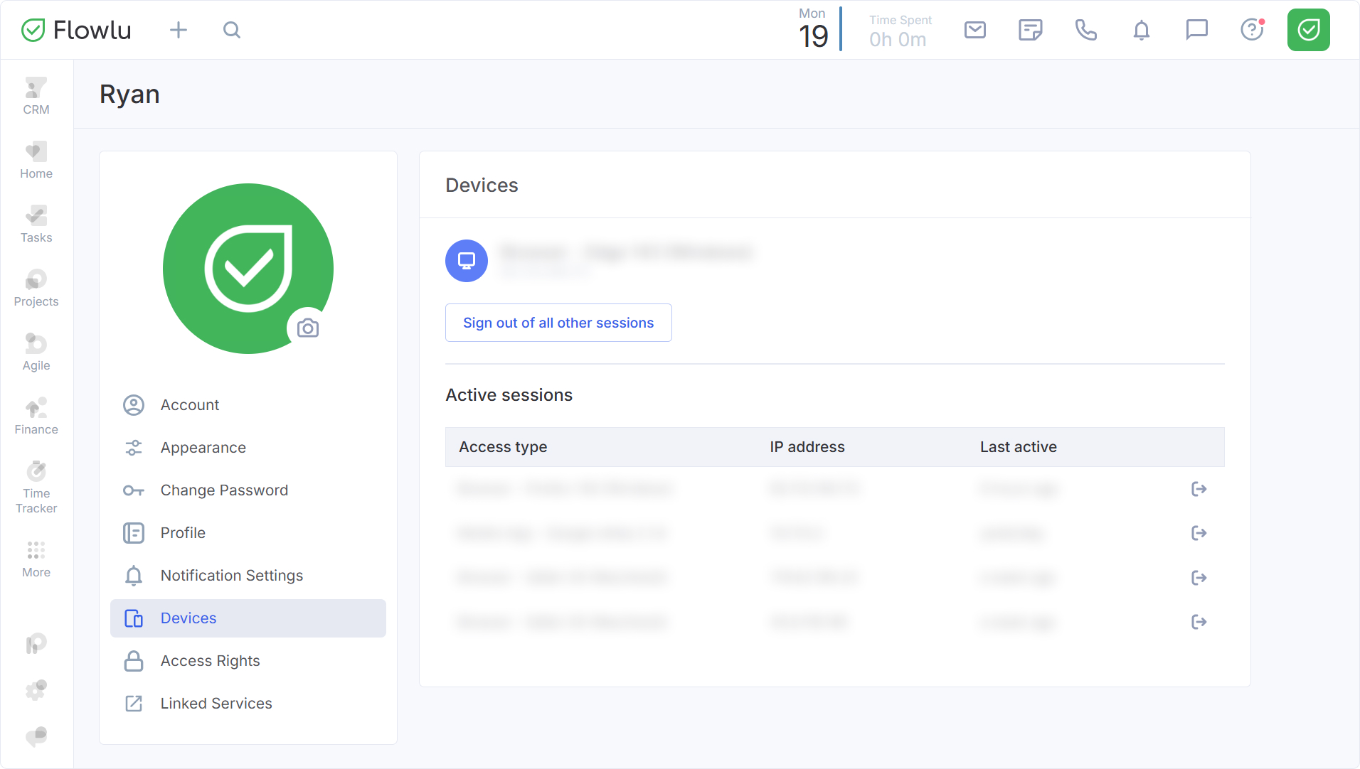 Garantizar la seguridad de su cuenta es una prioridad en Flowlu. Para brindarle un control total sobre el acceso a su cuenta, Flowlu cuenta con un Gestor de Sesiones. Esta herramienta le permite monitorear todas las sesiones activas en diferentes plataformas y navegadores, ayudándole a identificar accesos no autorizados o simplemente a gestionar sus inicios de sesión en varios dispositivos.