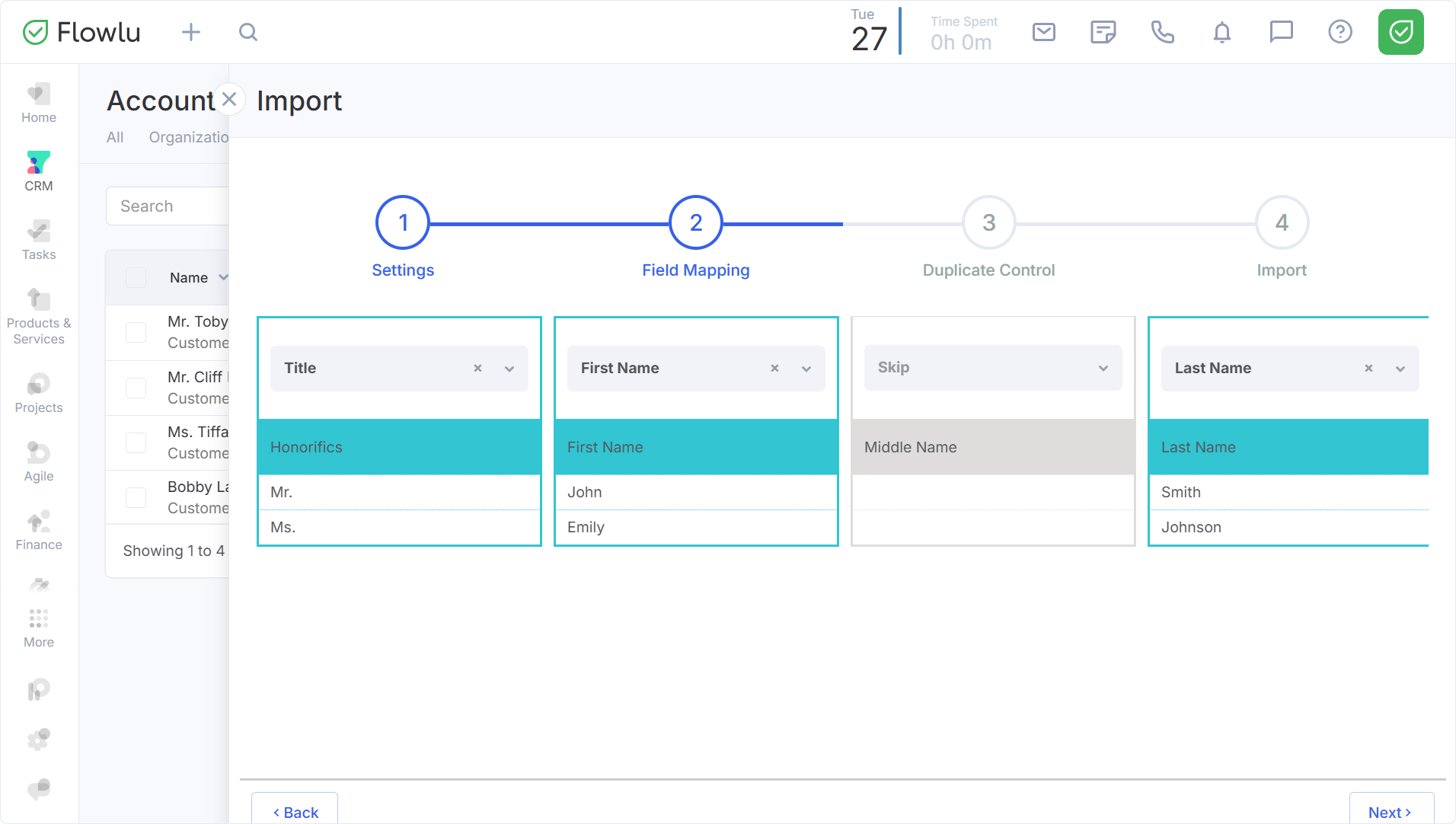 - Vincule sus campos: Esta es la parte más crítica de la importación. Haga coincidir cuidadosamente las columnas de su archivo CSV con los campos correspondientes en Flowlu, incluidos los campos personalizados que creó anteriormente.