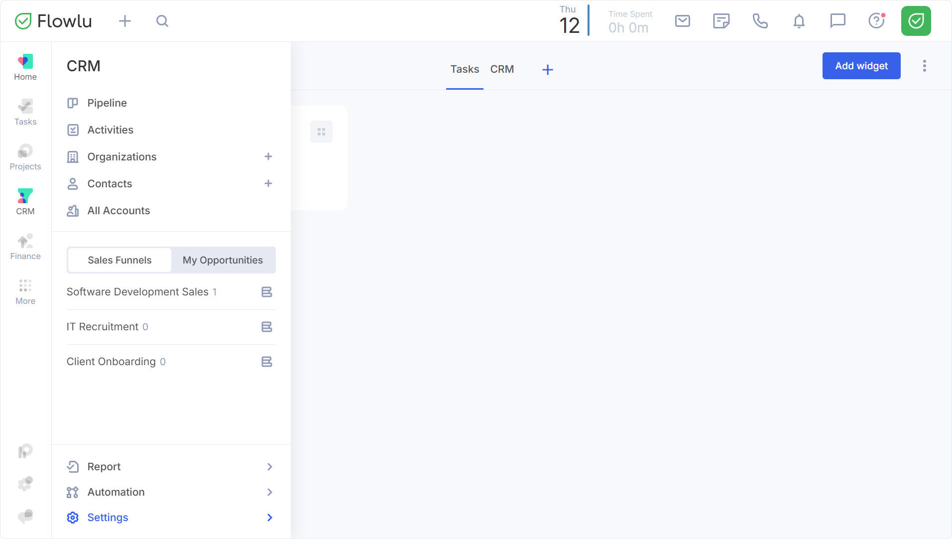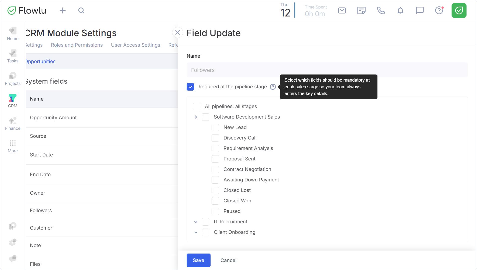 Mantener la integridad de los datos es crucial para cualquier proceso de ventas. Para ayudar a su equipo a cumplir con las normativas internas y capturar información crítica en el momento adecuado, Flowlu le permite configurar campos obligatorios para pipelines de ventas específicos y etapas individuales. Esto garantiza que una oportunidad no pueda avanzar hasta que se proporcionen los datos necesarios.