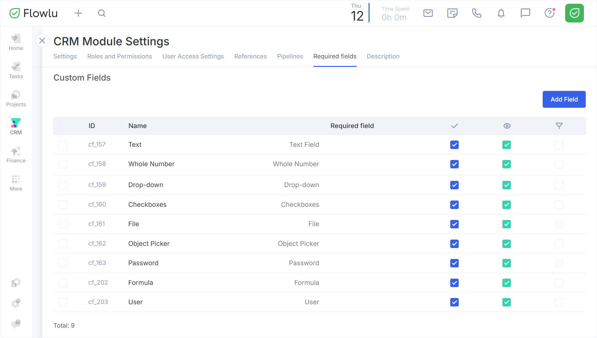 Nota: La funcionalidad de campos obligatorios específicos por etapa solo está disponible en los planes de suscripción premium de Flowlu (excepto en el antiguo plan Team).