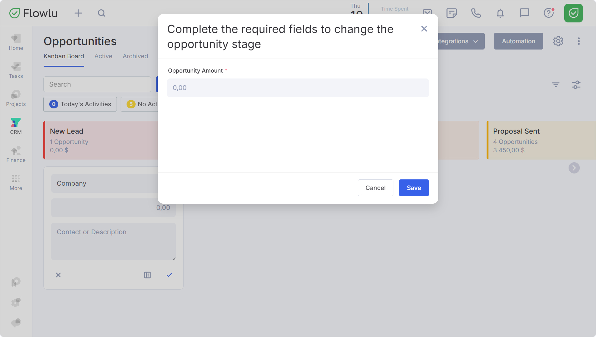 Si un campo es obligatorio para la primera etapa de un pipeline, Flowlu le impedirá guardar un nuevo registro si faltan esos datos. El sistema le notificará inmediatamente sobre los campos vacíos específicos.