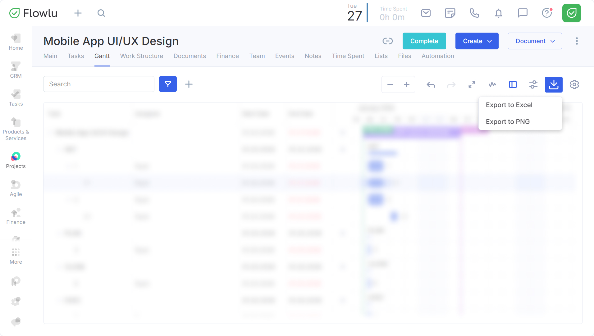 Gestionar proyectos complejos a menudo requiere compartir cronogramas con partes interesadas que pueden no tener acceso a su sistema interno. Para facilitar una colaboración y elaboración de informes fluida, Flowlu le permite exportar su diagrama de Gantt como una hoja de cálculo XLSX o una imagen PNG.